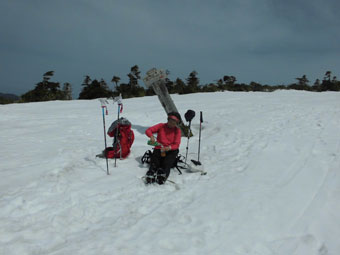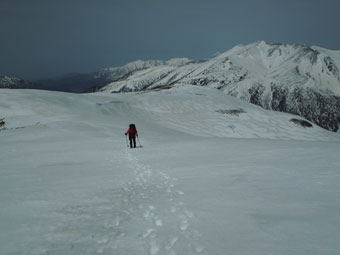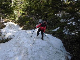 下山は、雪斜面を走って降りるから、相当時間の短縮になった。しかし、午前中にあった雪が消えていたり、落とし穴のような所が多くあり、少々手間取った。でも、寺地山までの登りでは、コーヒーが飲みたいとの思いで結構頑張ったのである。