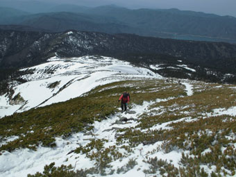 5/2 雪が現れたのは、打保との分岐(1,842米)手前辺りからであった。雪量自体が少ないのであるから、スノーシューを持参しなかったのが正解であった。寺地山着が午前9時15分くらいであったから、稜線には、いつもより早く着けるのではの期待が持たれたのである。
