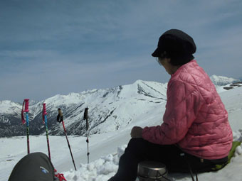 この展望があるからして、長い時間を掛けてやって来るのである。「今年登れないようなら、来年は尚更登れない。」 最近は、この言葉で「山ノ神」を奮い立たせているようなものだ。山頂は、風が強く、コンロが不適であった。ちょっと谷側に降りて食事をする事になる。