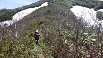 そのルートを下山して来る金沢の豆ちゃんと出会った。もしかしたら、H.18.01.02以来かもしれない。嬉しかった!飛び付きたいほど嬉しかった。私達と同じゲートから山頂まで3時間で登ってしまったというのであるから、どれだけ若いと言っても魂消てしまう。利賀から登って来る仲間を待つため、3時間ほど山頂で寝ていたと言うのだから、これも豪傑に値する。来週は、日帰りで大窓に行くと言っていたが・・・