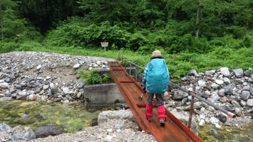 | 雨具を纏って百瀬川を渡る。 | 雨だから、新緑が眩しいとは言えないが・・ |