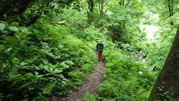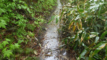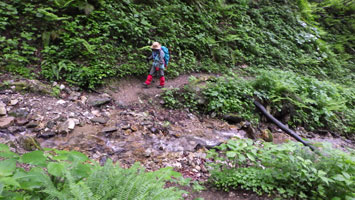 | 小沢を渡る。 | 草木での露で、びっしょりだ! |