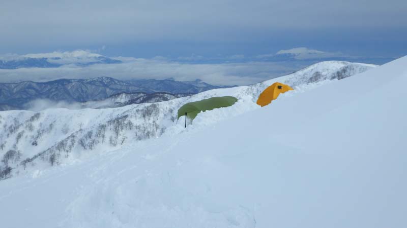 | 4時間半前に山頂に届いた。 | 強風の中、「居酒屋こんごう」を設置。 |