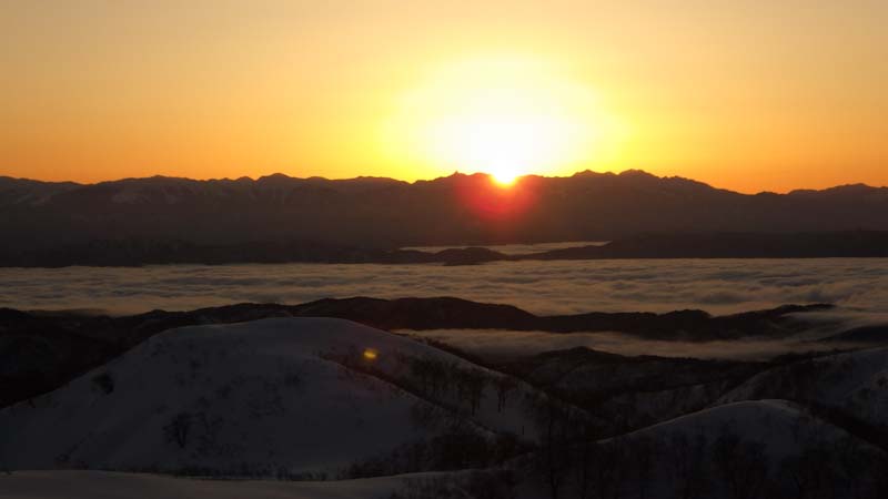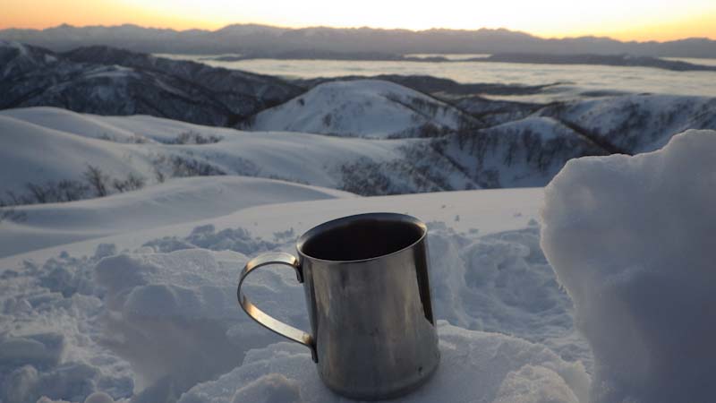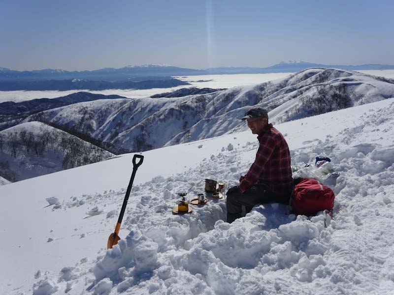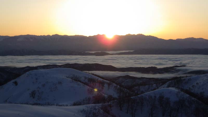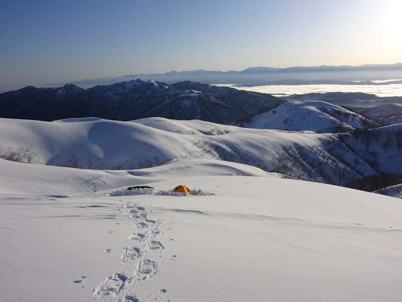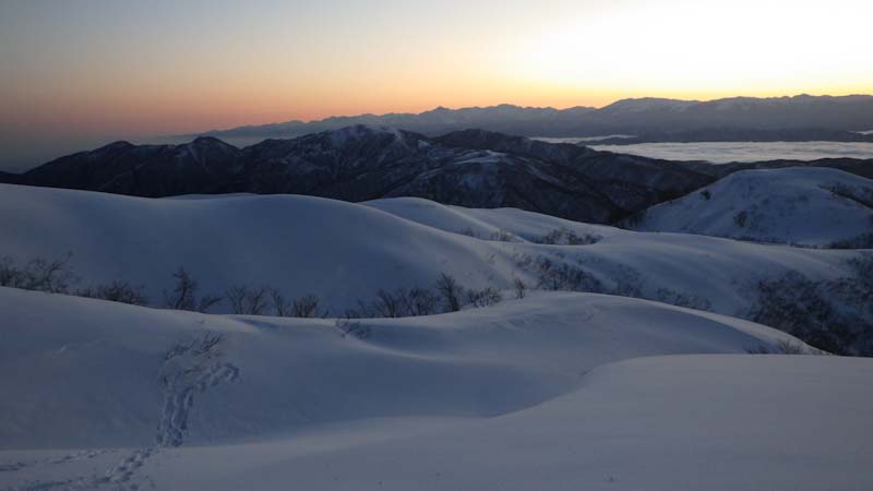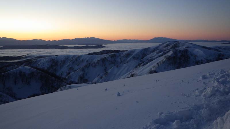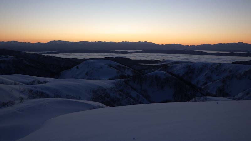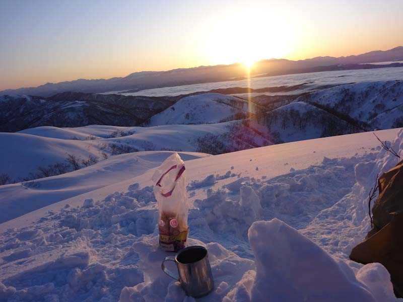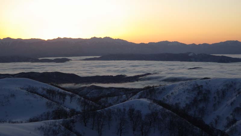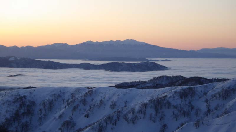 3/9 寝られないのならと午前5時過ぎから起きてしまった。一面雲海が広がっている。北アの山並みが、その上に鎮座している。剱岳も薬師岳も、槍穂高もである。ひと際目立っているのが、乗鞍岳と御嶽山である。シェルター(居酒屋こんごう)で、お湯を沸かしながら、まだかまだかと陽が昇って来るのを待つ。