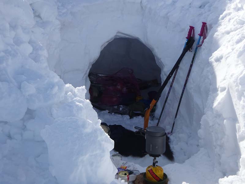 | 高さ170cm長さ200cm の雪洞を掘った。 | 独り善がりのアングルで・・ |