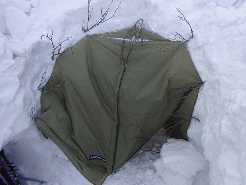 | 私一人には充分な広さです。 | タープは小枝で止めて、真ん中はファースナーです。 |