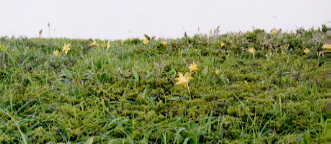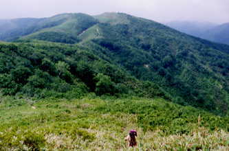 ガスで視界の効かない標高1,500㍍近い登山口から、黒土で一寸ぬかるんだブナ林を過ぎ、少し下って登り返し、ブナとネマガリダケの中を再び下り、また登り始めると、そこはもう風衝草原の始まりである。登り始めから15~20分程で、ゴゼンタチバナの白い花だけが何故か目立った。