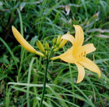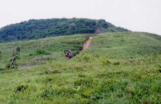 その後、また笹の生茂った中を掻き分けながら、何度かアップダウンを繰り返す頃から、ニッコウキスゲが姿を見せ始めてきた。草原の凹状の道に出た頃には、5分咲きながら良い雰囲気になって来た。奧金剛の山頂に立ってもなかなか登って来ない「山ノ神」に、リックを下ろして迎えに行くと、「長いものがいた。」と言って前に足がでないらしい。不思議な事に、私はこの何年間そんなものを見たことがない。