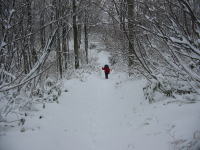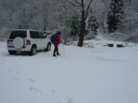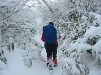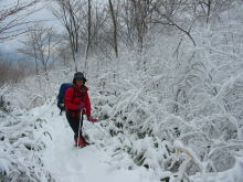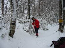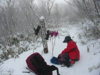 雨が上がったので利賀の金剛堂山行きにした。利賀村(最近、南砺市利賀になった。)に近付くと除雪した跡があり、百瀬のスノーバレー利賀スキー場の先は、真新しい雪の上を車を走らせた。栃谷登山口の積雪は10cm超。山頂付近は30~40cmの積雪であった。