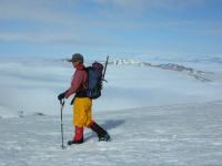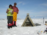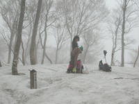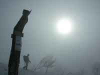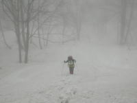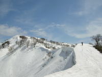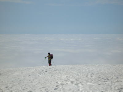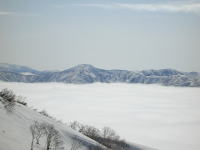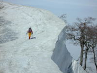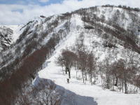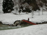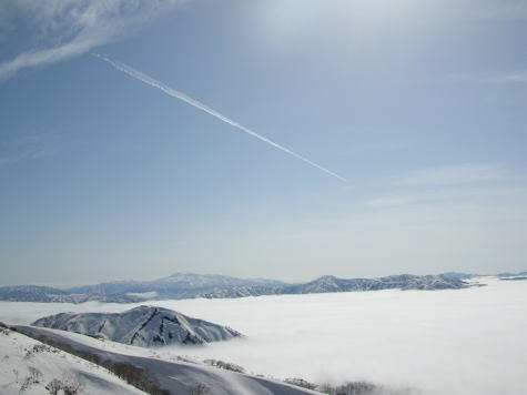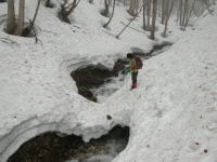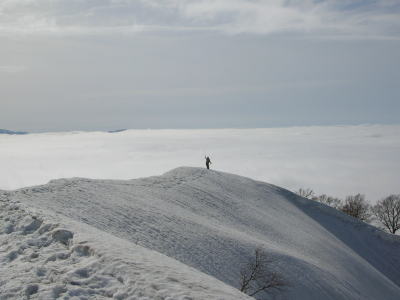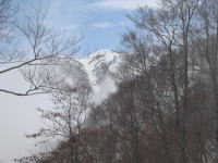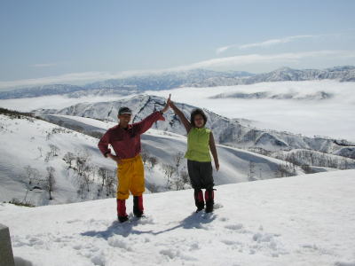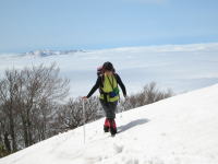 ■4/11 (略)足が悪いなど誰もが信用されないであろうが、どうやったら、もう少し歩けるのだろうかと、いつも頭の中はその事ばかりなのである。錆び付かせないなどの引用をするのも、惰性のまま歩き続けたい一心なのである。昨夜は、そのような状態と雨も予報もあり、合間をみて、「牛岳に行かれればそれでいい。」と思っていたのが、予報は私にとって良い方向に外れようとしていたので、急遽と言ってもチョット遅かったのですが、牛岳を通り越して、利賀の金剛堂山に向かってしまった。しかし、道中小雨が降り、それも利賀に近付くにつれてライトを点けなければいけないほどの視界不良であった。登山口10時発と1650mもある雪山の出発としては誉められたものではない。その山中も視界が70~80mくらいで、只、歩きに来たようなものだけだったが、標高1300mを抜けた頃から、青空が広がり、それこそ雪山での雲上の人となった。その光景は素晴らしく、各山の頂が雲上に浮かんで見えるのだから、少々お天気の悪い時でも山行は止められないのである。しかし、高度を上げる私達と雲の上昇が、追いかけっこになったが、ある程度の所で止まってくれ、その気分は最高であった。帰路は、その雲の中に入っていく訳であったが、まるで「くもの糸」を連想するような霧雨と共に、またまた視界が悪くなってしまった。登山口近くの沢に架かるスノーブリッジを渡るのもスリリングで、栃谷登山口まで車が入れないくらいの時の金剛堂山に、魅力があるのかもしれない。■