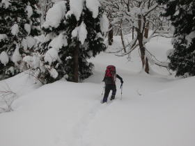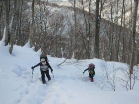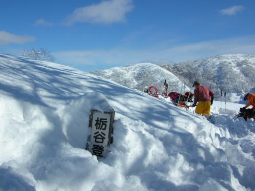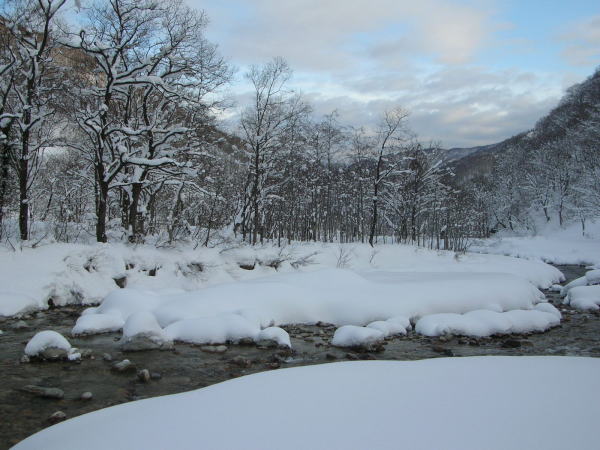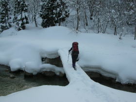 | 栃谷登山口から百瀬川を渡る | 予想より多い雪量に戸惑ったが、 何故かワクワク嬉しかった |