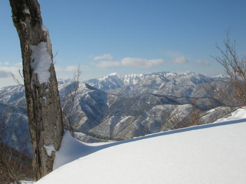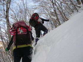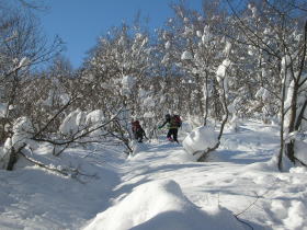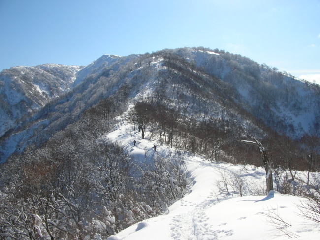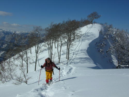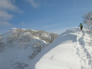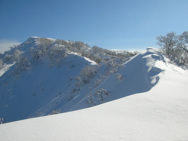 | 樹木の間から特徴のある三辻ヶ山を捉える | 今冬は雪庇が発達していなく快適な歩きが出来る |