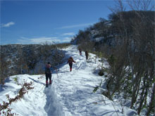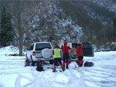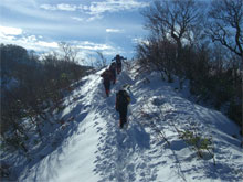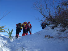 11/26 福井から3人の魔神達を迎えての金剛堂山は、絶好の山行日和に恵まれた。前日のトレースが、固く不規則で、ちょっぴり歩きにくかったが、ラッセルもなく、目標タイムより、相当速く登る事が出来た。その余裕が、中金剛まで足を延ばさせてくれ、真新しい雪上を、食事処とさせてくれた。