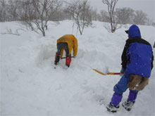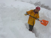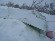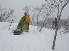 | まだ歩き始めて3時間なのだが・・ | 一服金剛の標識が見えてきた。 | 降雪が強くなって来たので、 簡易に荷置き場券待機所を造る |