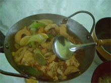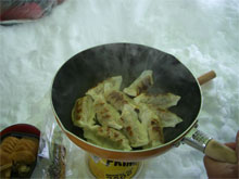 | 食事処も雪に覆われ掛けて・・ | まずは熱燗で・・(このポットがいい) | ギョウザもあるでよ! |