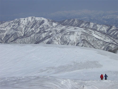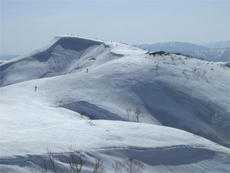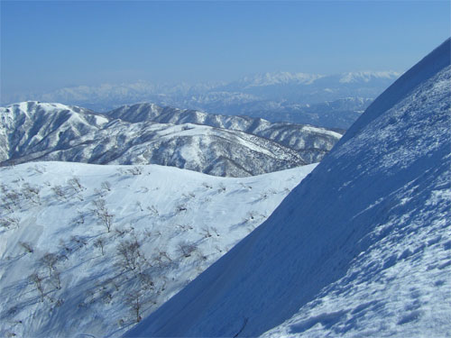 | 山頂付近から小白木峰・白木峰を望む。(後方は北アの山々) |
