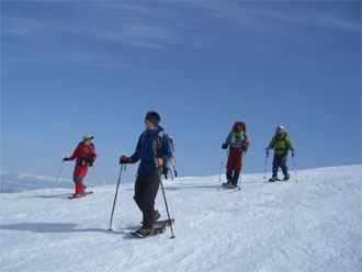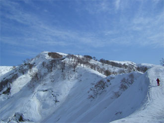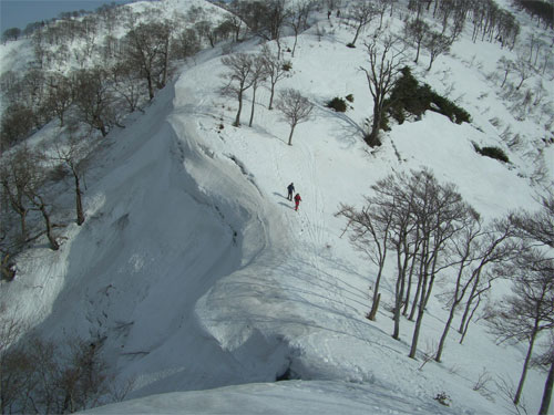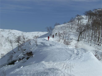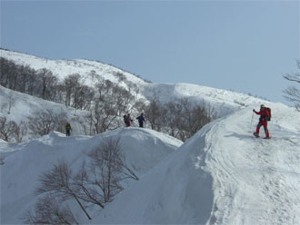 少なめの雪量がクラストしていて、最初の急登では戸惑いもあったが、栃谷からの本道と合流してからは、楽ちんそのもの。しかし、山頂に達し、いざ、風防を備えたシェルター造りとなると、雪量が足らず、場所を変えて、三つ目でようやくOK!となった程であった。