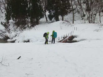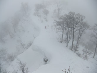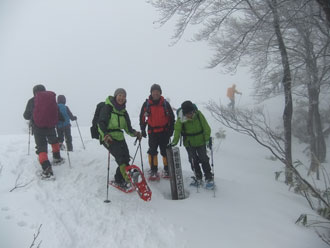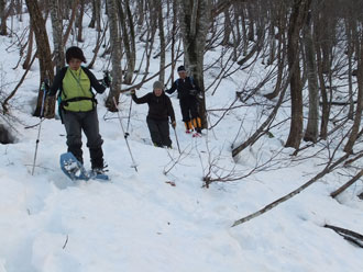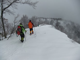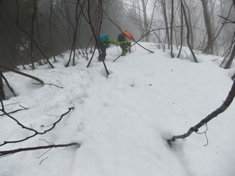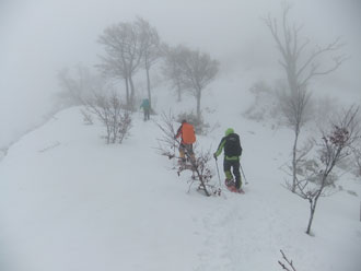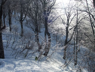 下山は、時々陽が差し、ガスが晴れる時があった。「きれいだね!」 と足を止めては声を上げた。そして、栃谷登山口に降りず、直接スキー場駐車場を目指した。本格的にスノーシューを履くのは初めてとあって、所々に大きな穴をあけてしまったが、それも愛嬌というものであろう。