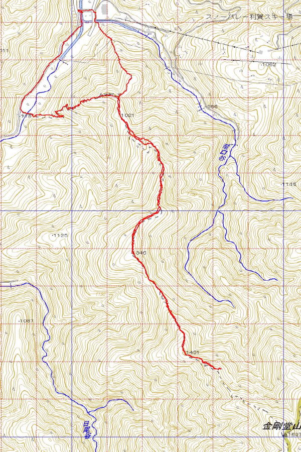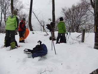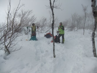 スキー場から林道を歩き、栃谷登山口から取り付く。 栃谷登山口から4キロ地点でシェルターを造り休憩。下山路は、 「栃谷から1キロ地点」付近から、直接スキー場駐車場に降りた。 |