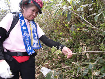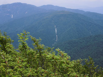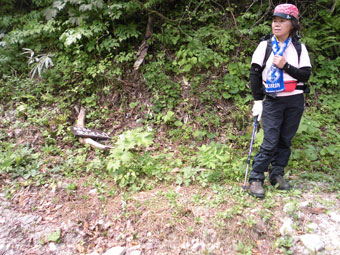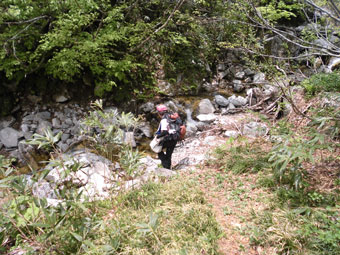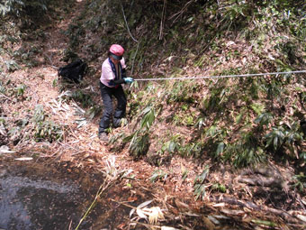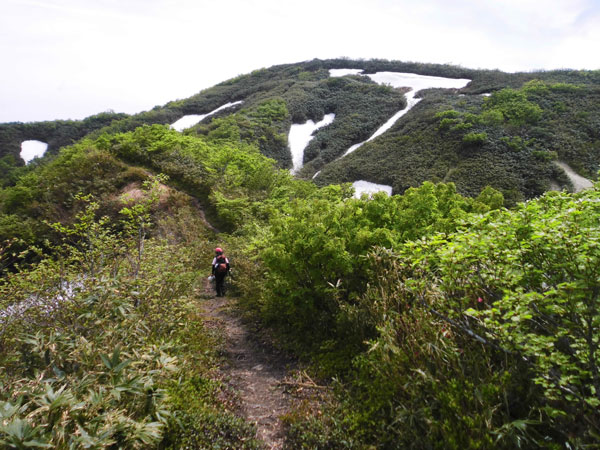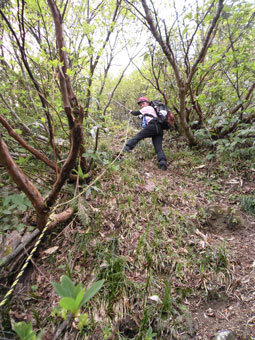 | 一カ所沢がある。遅くまで雪が残る。 | 急登箇所にはロープが施してある。 |