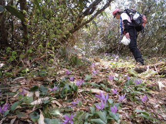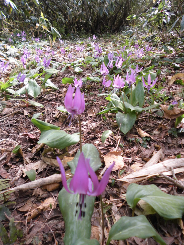 | 雪解けの水溜まりを避けて・・ | カタクリの群落の中を・・ 踏まないように・・ |