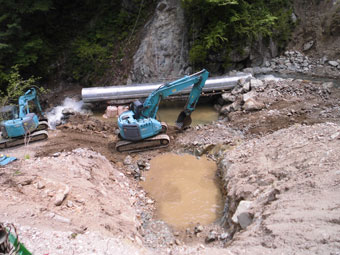大長谷川の支流・西ノ瀬戸谷の工事現場。 金剛堂山登山口近く。 |