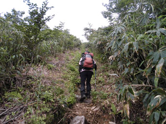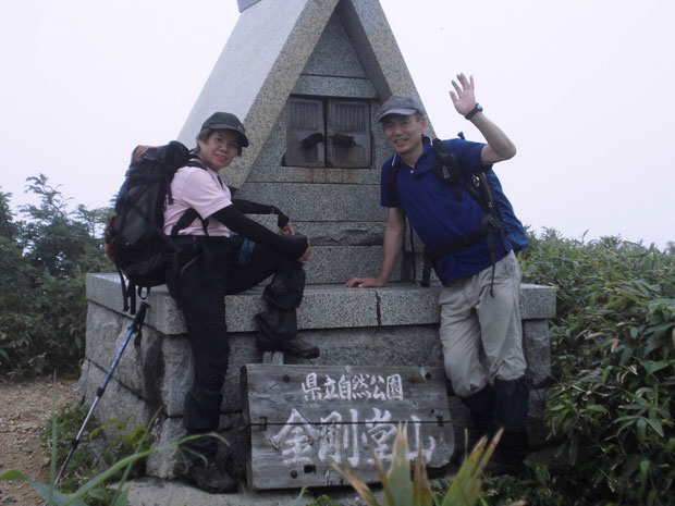 | ササに覆われた溝状の登山道を駆け上がれば・・ | 待望の金剛堂山頂上である。(前金剛) |