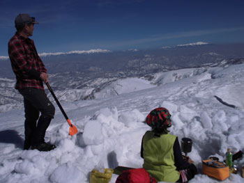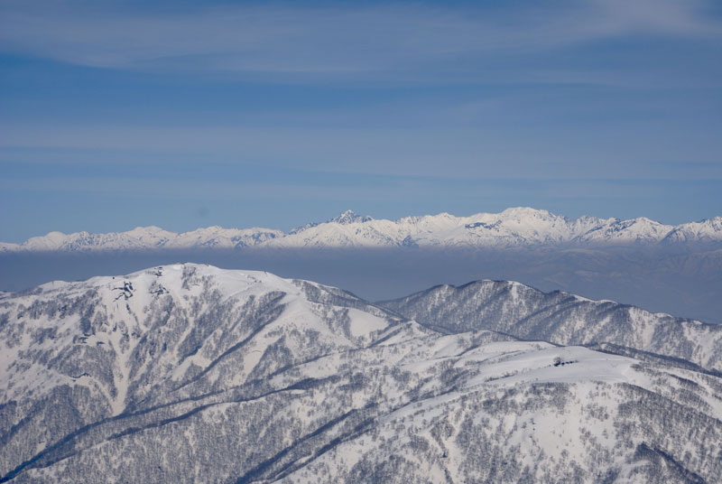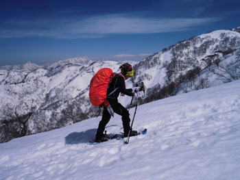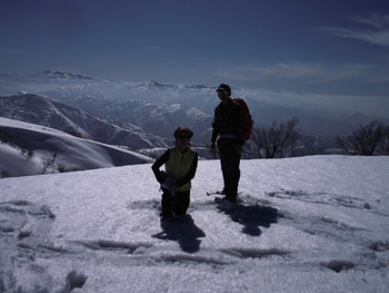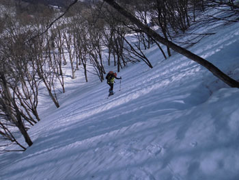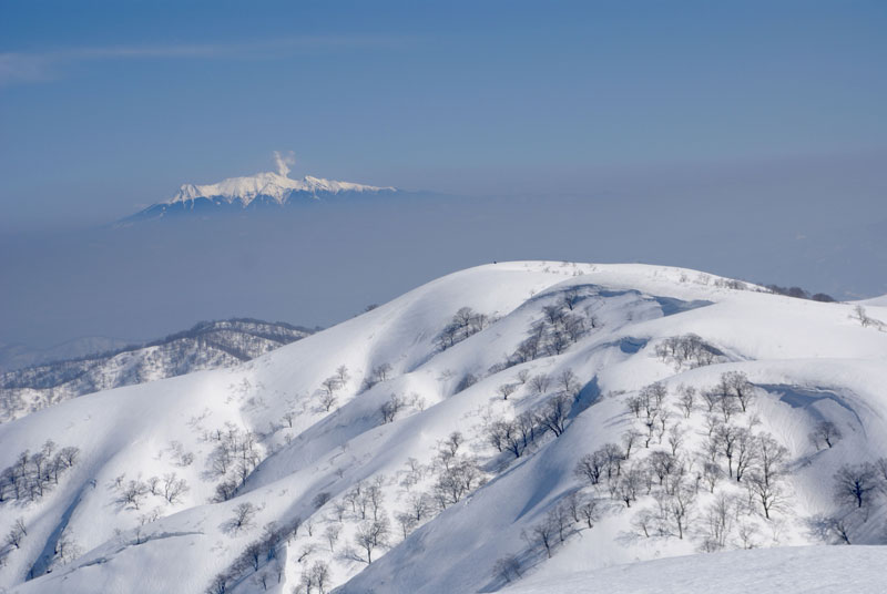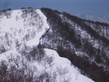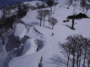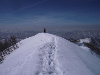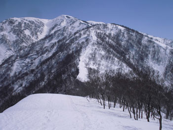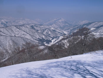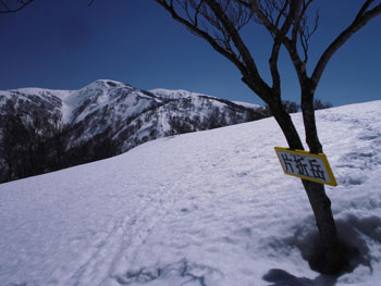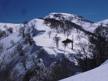 それでも、4時間余で山頂に立てたのだから、この上ない喜びである。山頂には、スキー場から登り、その峰々を伝って来られた大阪のカップルが休んでおられた。挨拶を交わし、その自慢話を少々お聞きした後、我々が登って来た所へ滑り込んで行かれた。
