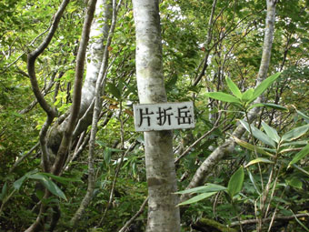 雪がないと、ちょっと寂しい片折岳の標識。 |