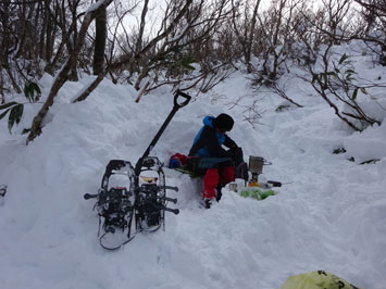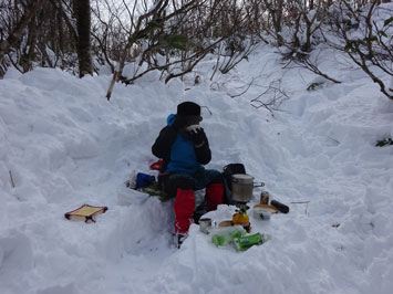 予報はピーカン。冷え込むと思っていたが、いざ来てみると曇りがち。そして、上部では、物凄い風が吹きまくり、雰囲気は良くなかった。食事をしようかどうか迷ったが、その雰囲気を写真に撮ろうと、タープを張ろうにも飛ばされ気味、雪質はパウダー状でブロックにもならない。
