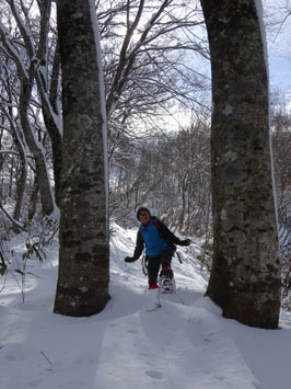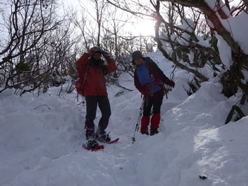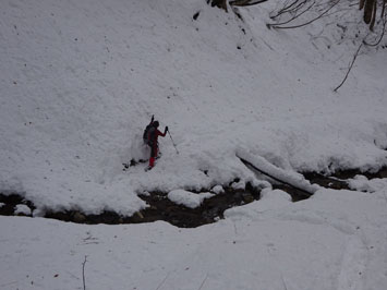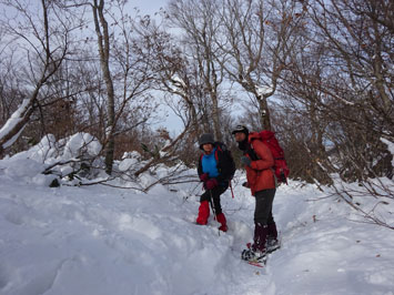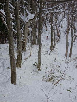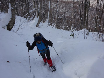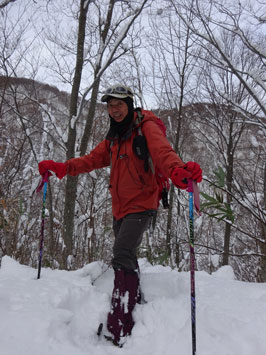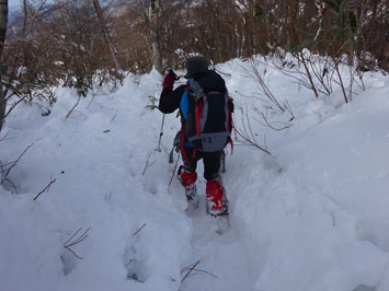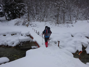 百瀬川に架かる鉄製の橋の手すりが外されているが、慎重に渡れば問題はない。高度を上げれば雪量が増える。登山道は凹だから、当然雪が深い。そして、小枝が倒れているから、払い除けなければいけない。時間は、どんどん経過して行く。