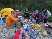 薬師峠でテントを張り(3張)、「山ノ神」を除いての5名で薬師岳山頂を目指した。そのまま、宴会に入れば、「どれだけ酒があっても足りなくなるから・・」 などと言いながら、薬師峠に入った頃、登頂を終え降って来る筏井氏と遭遇。日帰り予定だし、元々健脚の方だから、そういう時間帯に出会うのは最もであるが、我々は、彼をキャンプに誘った。日帰りでやって来ているのだから、装備もなく 「ちょっと考えてみる。」 というのは当たり前であるが、酒・熟女の誘惑に負けたとは言わないが、久し振りの山友との交流を選んでくれたに違いない。( ´艸`)