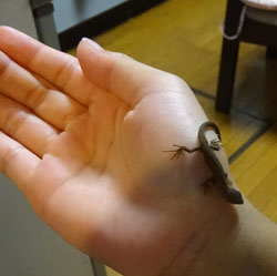 長いしっぽを入れても、3~4cmくらいで実に可愛かったので捕まえたのであるが、「山ノ神」は、ヘビやトカゲなどの爬虫類どころか、カエルやイモリなどの両生類もダメで、触るどころか、見るのもイヤという程である。