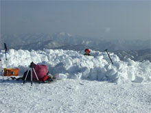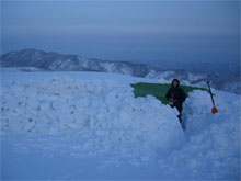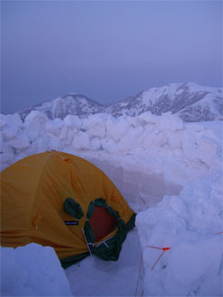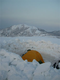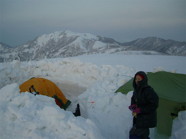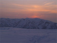 車デボ地点から、5時間余で、小白木峰の山頂に立つ事が出来たが、それからが、また一仕事がある。2時間以上掛かって、テン場と食事処を造り上げ、防寒具を着込んで、やっと食事に有り付けた。そして、夕陽を眺めながら、またまた4時間程掛けて、2Lの清酒を飲み干したのである。