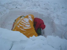 | 深く掘ったシェルターとの別れ・・ | a.m.9:30 キャンプサイト発。 | 白木峰へ向かう事を決意して・・・ |
