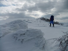 焼山も風が強く食事処には適さず大鷲山との鞍部付近にそれを求めた。風がないところと思っても、風がすぐに舞う。あっという間に、背丈ほどのシェルターを掘ってくれたので、それ程の寒さを感じなかったが、でも、ヒューとくれば、身が縮こまる。温かい鍋が三つもあり、これでもかと食べた。食べられるから、皆は強いのかもしれない。