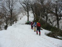 相変わらず風は強く、ドンドン雲が流れ、先行きの不安を感じながらの登高となる。 大品山から、1時間経過した1630mで休息してアイゼンを着ける。