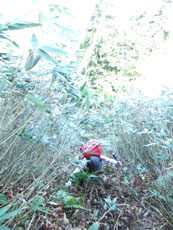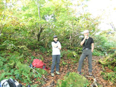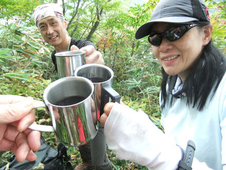 時間制限下のクズバ山であったが、下山に掛かった頃から、ガスが掛かり始め、「ラッキー」 の声は、皆満足の思いと受け取った。降りは、大丈夫なのかと思ったが、一度も転ぶこともなく、立山川側の登山口に、午後3時前に戻る事が出来た。