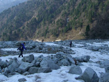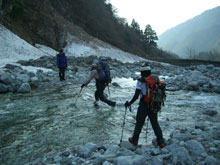 少ない雪の河原を行く。 |