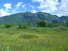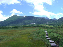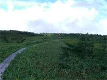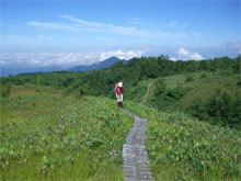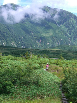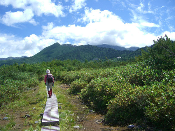 | 大日連山をバックに快適な遊歩道を行く。 |