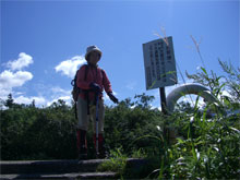 大きく見えた大日岳や、反対の鍬崎山や薬師岳が見えた時は、その素晴らしさに「おお~っ」 と声を上げたくなるのほどであったが、次第にガスに巻かれてしまうと、只ひたすらに木道を歩くだけになってしまった。松尾峠の三角点に触れた頃、ヤッホーと言う声が聞こえた。展望台にいた人の声である。私達が行くと、「今まで見えたのに・・」 と、大展望を拝んだだけに、私達に申し訳なさそうに話て下さった。