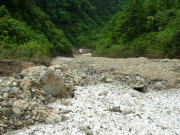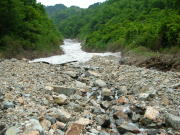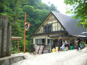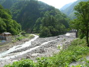 餓鬼山から唐松岳へのルートを右に見過ごし、長い鉄製の橋を渡る。その右岸に祖母谷温泉がある。河原の何処かを掘ればすぐ熱い湯が噴き出るような雰囲気の場所である。
