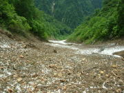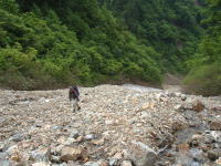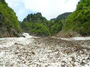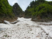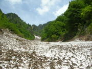 6月だからであろう、沢の取付きには雪がない。ゴロゴロしたガラ場を行く事になる。途中百貫山・不帰岳・清水岳・白馬岳方面への登山道らしきものを沢の左岸に見過ごした。