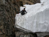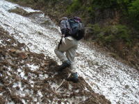 先日の遭難騒ぎの時に使われたと思える捨て縄を頼りに、岩と土の斜面に取付いたが、若き戦士・長勢君は、クレパス上部にピッケルを鳶口のようにさして、スルスルと登って行ってしまった。