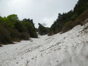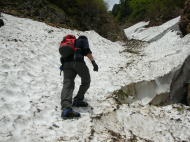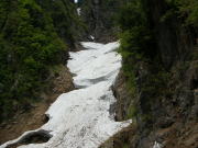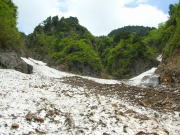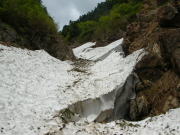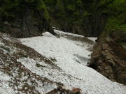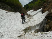 あまり急だとは思わない雪渓だが、振り返ると結構角度があり、そうすぐだと思っている地点まで、なかな到達しなかった。しかし、10時15分で標高1186m、10時50分で二又の1400m超に達し、右側の沢(谷)に入った。二日前の長勢君は、もっと急な左側の谷(沢)に入ったらしいが、間違いと気付き下るのに難儀したらしい。