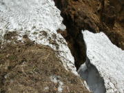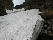 もうここまで来れば、今日の目的を達成したようなものだが、やっぱり欲が出て、もう少しになってしまった。行けば行くほど、谷は狭まり雪の斜面が急になった。そして、大きな雪の割れ目が口を開けたように、容易に先に進ませてくれない。