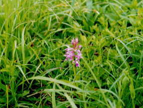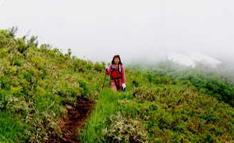 2,000年とやま国体の登山競技の会場にでもなるのだろうか、ところどころに小さな標柱が建っていた。一寸ぬかるむ山道脇に採り残されたひ弱なワラビが、また今夜の食卓に酒の肴となって上るかもしれないと思いながら、相変らずのマイペースで登って来る家内が追いつくまで時々立ち止まって待たなければいけない。汗ばんだ身体に曇り空ながらも時折強い日差しを受け、額から目に流れ込む汗を払いのけなければならない作業が一層堪える。