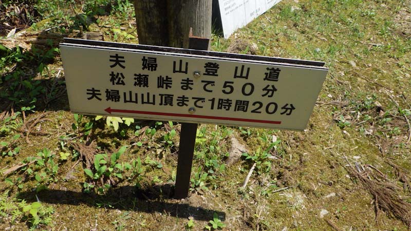 休日には、高低を問わずともお山のてっぺんに登りたい私は、夫婦山を選んだ。二本杉からの牛岳は、2~3週間前に登ったし、林道を通って山頂へも面白くなかったからである。あわよくは、夫婦山と祖父岳に2座を目論んだが、松瀬から登山口への林道が、CLOSEとなっていたので、それに従い駐車場に車を停めて夫婦山だけにした。