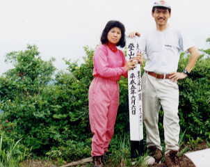 男峰30分、女峰20分の標識が有り、小井波と松瀬へも通じる交差点でも有る。岩と岩との間を潜ったり3ヶ所のトラ縄が張ってある急な所を登ると展望台に出る。そこから3分程で男峰の頂上に着く。もう終わりがけのレンゲツツジが咲いていた。何時もは結構展望がいいのだが、今日は、モヤが経ち込めているため、祖父岳と戸田峰が薄っすら見えるだけの寂しい山頂の人となった。