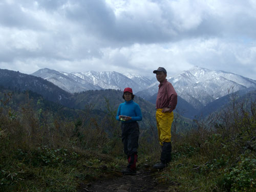 | この度の寒波で、雪を頂いた山々をバックに山頂で・・・ |